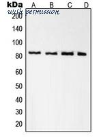 Western blot analysis of Radixin expression in A431 (A); K562 (B); NIH3T3 (C); PC12 (D) whole cell lysates.