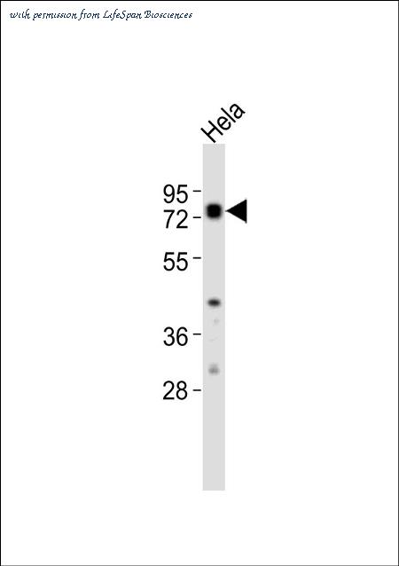 Anti-Radixin Antibody at 1:1000 dilution + HeLa whole cell lysates Lysates/proteins at 20 ug per lane. Secondary Goat Anti-Rabbit IgG, (H+L),Peroxidase conjugated at 1/10000 dilution Predicted band size : 69 kDa Blocking/Dilution buffer: 5% NFDM/TBST.