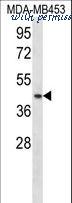 RING1 Antibody western blot of MDA-MB453 cell line lysates (35 ug/lane). The RING1 antibody detected the RING1 protein (arrow).