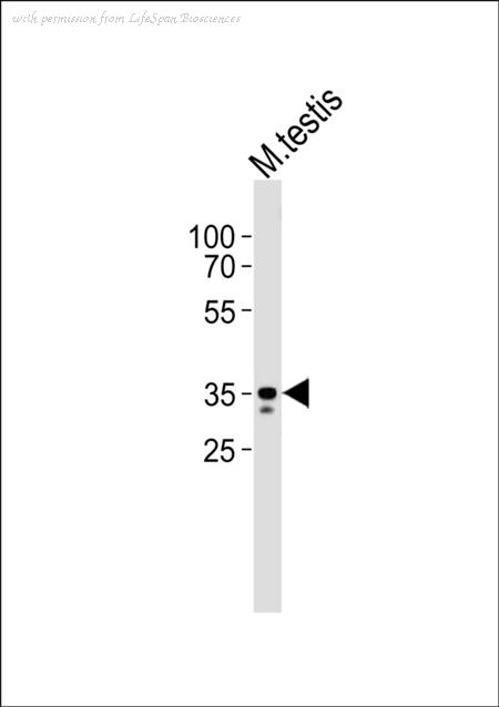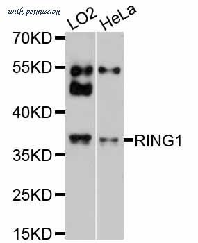 Western blot of lysate from mouse testis tissue with Mouse Ring1 Antibody. Antibody was diluted at 1:1000. A goat anti-rabbit IgG H&L (HRP) at 1:10000 dilution was used as the secondary antibody. Lysate at 20 ug.