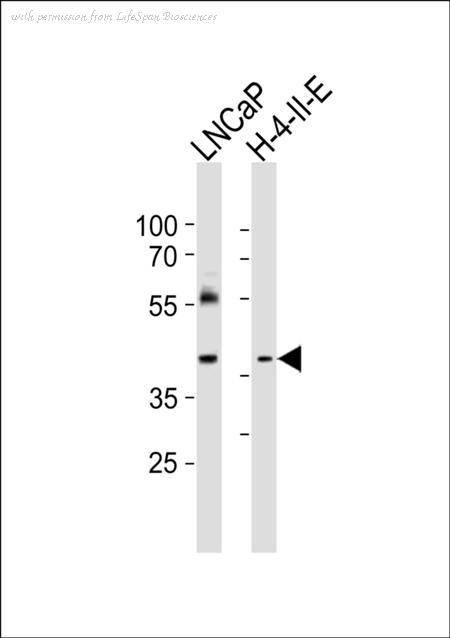 Western blot of lysates from LNCaP, rat H-4-II-E cell line (from left to right) with RING1 Antibody. Antibody was diluted at 1:1000 at each lane. A goat anti-rabbit IgG H&L (HRP) at 1:10000 dilution was used as the secondary antibody. Lysates at 20 ug per lane.
