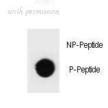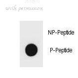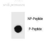 Dot blot of rat TSC1 Antibody (Phospho Y297) Phospho-specific antibody on nitrocellulose membrane. 50ng of Phospho-peptide or Non Phospho-peptide per dot were adsorbed. Antibody working concentrations are 0.6ug per ml.