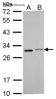 SDHB antibody [C2C3], C-term detects SDHB protein by Western blot analysis. A. 30 ug THP-1 whole cell lysate/extract. B. 30 ug NCI-H929 whole cell lysate/extract. 12 % SDS-PAGE. SDHB antibody [C2C3], C-term dilution:1:1000