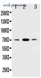 WB of SDHB antibody. All lanes: Anti-SDHB at 0.5ug/ml. Lane 1: Rat Testis Tissue Lysate at 40ug. Lane 2: Rat Cardiac Muscle Tissue Lysate at 40ug. Lane 3: JURKAT Whole Cell Lysate at 40ug. Predicted bind size: 70KD. Observed bind size: 70KD.