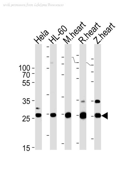 DANRE sdhb Antibody western blot of HeLa, HL-60 cell line, mouse heart, rat heart, zebra fish heart tissue lysates (35 ug/lane). The DANRE sdhb antibody detected the DANRE sdhb protein (arrow).