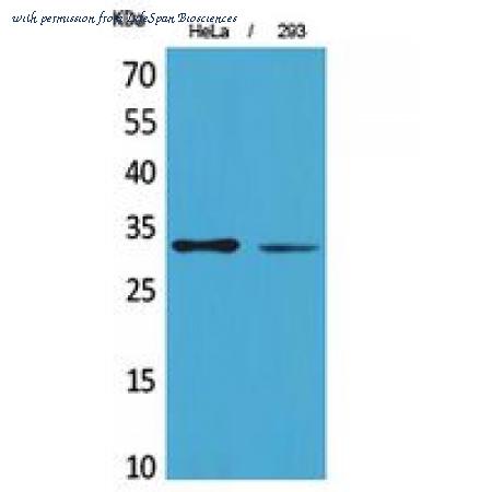 Western blot of lysates from mouse heart, mouse liver, rat heart tissue, HL-60, A431, HepG2 cell line (from left to right) with (DANRE) sdhb Antibody. Antibody was diluted at 1:1000 at each lane. A goat anti-rabbit IgG H&L (HRP) at 1:10000 dilution was used as the secondary antibody.