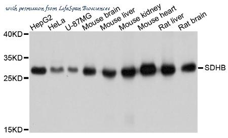 Western blot analysis of extracts of various cell lines, using SDHB antibody at 1:1000 dilution. The secondary antibody used was an HRP Goat Anti-Rabbit IgG (H+L) at 1:10000 dilution. Lysates were loaded 25ug per lane and 3% nonfat dry milk in TBST was used for blocking. An ECL Kit was used for detection and the exposure time was 1s.