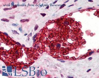Anti-Band 3 antibody IHC of human placenta, erythrocytes. Immunohistochemistry of formalin-fixed, paraffin-embedded tissue after heat-induced antigen retrieval. Antibody concentration 10 ug/ml.