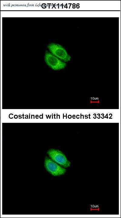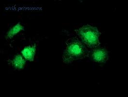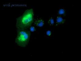 Immunofluorescence of methanol-fixed A549 using Syntrophin alpha 1 antibody at 1:500 dilution.