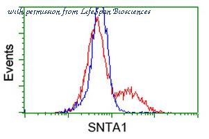 HEK293T cells transfected with either overexpress plasmid (Red) or empty vector control plasmid (Blue) were immunostained by anti-SNTA1 antibody, and then analyzed by flow cytometry.