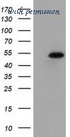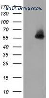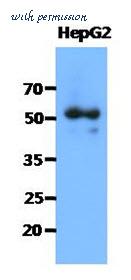 Western Blot: The cell lysates of HepG2 (40 ug) were resolved by SDS-PAGE, transferred to PVDF membrane and probed with anti-human SNTA1 antibody (1:1000). Proteins were visualized using a goat anti-mouse secondary antibody conjugated to HRP and an ECL detection system.