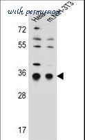 SSR1 Antibody western blot of HeLa,mouse NIH-3T3 cell line lysates (35 ug/lane). The SSR1 antibody detected the SSR1 protein (arrow).