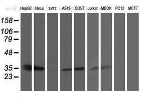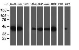Western blot of extracts (35 ug) from 9 different cell lines by using anti-SSR1 monoclonal antibody (HepG2: human; HeLa: human; SVT2: mouse; A549: human; COS7: monkey; Jurkat: human; MDCK: canine; PC12: rat; MCF7: human).
