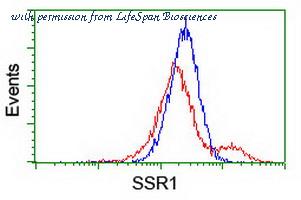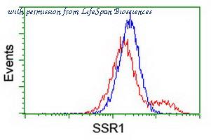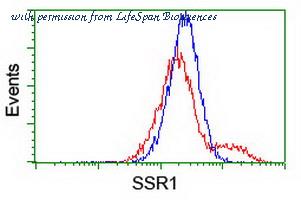 HEK293T cells transfected with either overexpress plasmid (Red) or empty vector control plasmid (Blue) were immunostained by anti-SSR1 antibody, and then analyzed by flow cytometry.