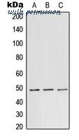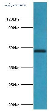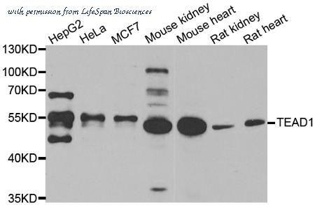 Western blot. All lanes: Transcriptional enhancer factor TEF-1 antibody at 9 ug/ml+HeLa whole cell lysate. Secondary antibody: Goat polyclonal to rabbit at 1:10000 dilution. Predicted band size: 48 kDa. Observed band size: 48 kDa.