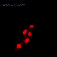 Immunofluorescent analysis of TEAD1 staining in Raw264.7 cells. Formalin-fixed cells were permeabilized with 0.1% Triton X-100 in TBS for 5-10 minutes and blocked with 3% BSA-PBS for 30 minutes at room temperature. Cells were probed with the primary antibody in 3% BSA-PBS and incubated overnight at 4 C in a humidified chamber. Cells were washed with PBST and incubated with a DyLight 594-conjugated secondary antibody (red) in PBS at room temperature in the dark. DAPI was used to stain the cell nuclei (blue).