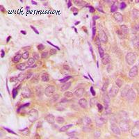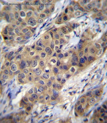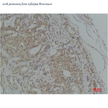 Immunohistochemical analysis of TGF beta 1 staining in human breast cancer formalin fixed paraffin embedded tissue section. The section was pre-treated using heat mediated antigen retrieval with sodium citrate buffer (pH 6.0). The section was then incubated with the antibody at room temperature and detected using an HRP conjugated compact polymer system. DAB was used as the chromogen. The section was then counterstained with hematoxylin and mounted with DPX.