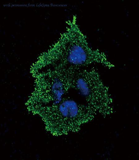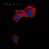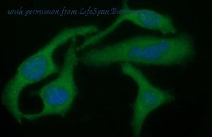 Immunofluorescent staining of HeLa cells using anti-TGFB1 mouse monoclonal antibody.