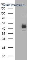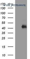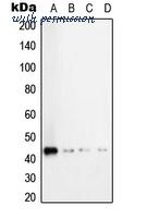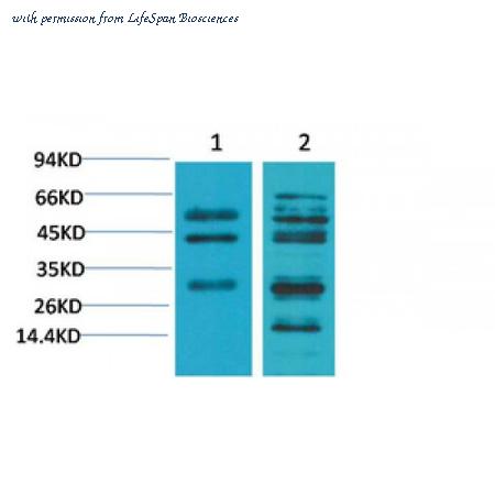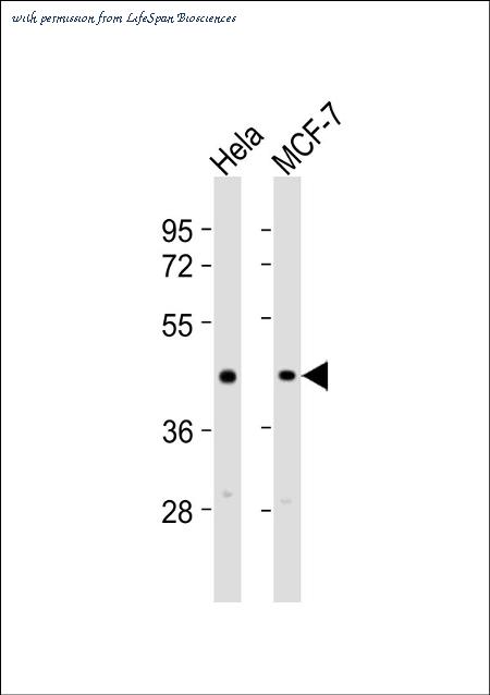 All lanes : Anti-TGF beta 1 Antibody at 1:1000 dilution Lane 1: HeLa whole cell lysates Lane 2: MCF-7 whole cell lysates Lysates/proteins at 20 ug per lane. Secondary Goat Anti-Rabbit IgG, (H+L),Peroxidase conjugated at 1/10000 dilution Predicted band size : 44 kDa Blocking/Dilution buffer: 5% NFDM/TBST.