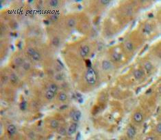 Confocal immunofluorescence of TGFB1 Antibody with HepG2 cell followed by Alexa Fluor 488-conjugated goat anti-rabbit lgG (green). DAPI was used to stain the cell nuclear (blue).