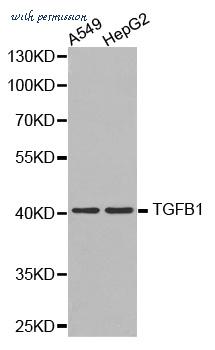 Western blot analysis of extracts of various cell lines, using TGFB1 antibody. The secondary antibody used was an HRP Goat Anti-Mouse IgG (H+L) at 1:10000 dilution. Lysates were loaded 25ug per lane and 3% nonfat dry milk in TBST was used for blocking.