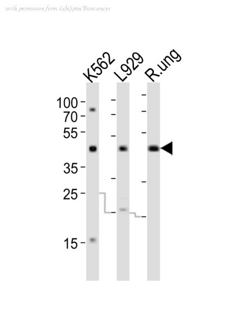 Western blot of lysates from K562, L929 cell line and rat lung tissue(from left to right), using TGFB1 antibody diluted at 1:1000 at each lane. A goat anti-rabbit IgG H&L (HRP) at 1:10000 dilution was used as the secondary antibody. Lysates at 20 ug per lane.