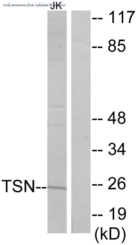 Western blot analysis of lysates from Jurkat cells, using TSN Antibody. The lane on the right is blocked with the synthesized peptide.