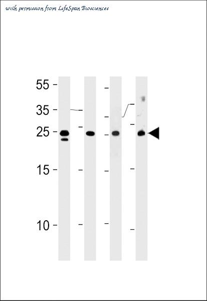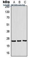 Western blot analysis of Translin expression in MCF7 (A); HeLa (B); HepG2 (C) whole cell lysates.
