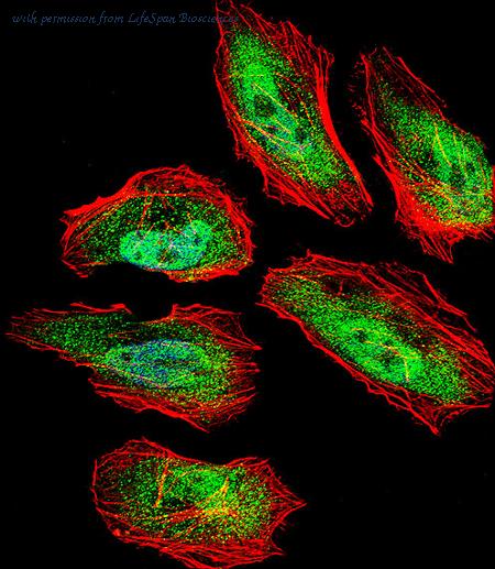 Fluorescent confocal image of HeLa cell stained with TSN Antibody. HeLa cells were fixed with 4% PFA (20 min), permeabilized with Triton X-100 (0.1%, 10 min), then incubated with TSN primary antibody (1:25, 1 h at 37°C). For secondary antibody, Alexa Fluor 488 conjugated donkey anti-rabbit antibody (green) was used (1:400, 50 min at 37°C). Cytoplasmic actin was counterstained with Alexa Fluor 555 (red) conjugated Phalloidin (7units/ml, 1 h at 37°C). Nuclei were counterstained with DAPI (blue) (10 ug/ml, 10 min). TSN immunoreactivity is localized to Nucleus and Cytoplasm significantly.