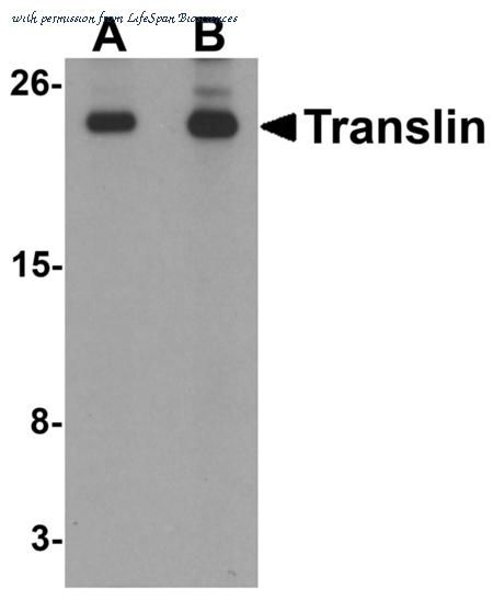 Western blot analysis of Translin in rat lung tissue lysate with Translin antibody at (A) 0.5 and (B) 1 ug/ml