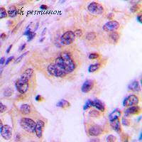 Immunohistochemical analysis of Translin staining in human lung cancer formalin fixed paraffin embedded tissue section. The section was pre-treated using heat mediated antigen retrieval with sodium citrate buffer (pH 6.0). The section was then incubated with the antibody at room temperature and detected using an HRP conjugated compact polymer system. DAB was used as the chromogen. The section was then counterstained with hematoxylin and mounted with DPX.