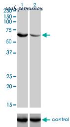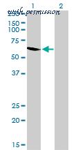 Western Blot analysis of UGP2 expression in transfected 293T cell line by UGP2 monoclonal antibody (M01), clone 3H3.Lane 1: UGP2 transfected lysate(56.9 KDa).Lane 2: Non-transfected lysate.