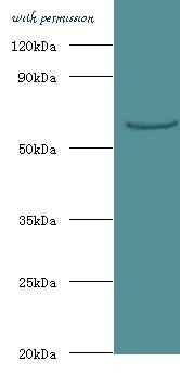 Western blot of UTP--glucose-1-phosphate uridylyltransferase antibody at 2 ug/ml with mouse liver tissue secondary Goat polyclonal to rabbit at 1:10000 dilution predicted band size: 57 KDa observed band size: 57 KDa. This image was taken for the unconjugated form of this product. Other forms have not been tested.