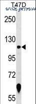 ZNF217 Antibody western blot of T47D cell line lysates (35 ug/lane). The ZNF217 antibody detected the ZNF217 protein (arrow).