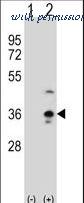 Western blot of COLEC11 (arrow) using rabbit polyclonal COLEC11 Antibody. 293 cell lysates (2 ug/lane) either nontransfected (Lane 1) or transiently transfected (Lane 2) with the COLEC11 gene.
