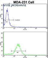 Flow cytometric of MDA-231 cells using COLEC11 Antibody (bottom histogram) compared to a negative control cell (top histogram). FITC-conjugated goat-anti-rabbit secondary antibodies were used for the analysis.