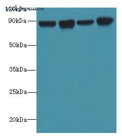 Western blot. All lanes: DDX50 antibody at 4 ug/ml. Lane 1: HeLa whole cell lysate. Lane 2: Jurkat whole cell lysate. Lane 3: K562 whole cell lysate. Lane 4: 293T whole cell lysate. Secondary Goat polyclonal to Rabbit IgG at 1:10000 dilution. Predicted band size: 83 kDa. Observed band size: 83 kDa.
