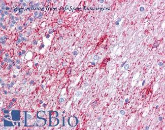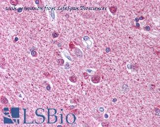 Anti-ATG9A antibody IHC of human brain, cortex. Immunohistochemistry of formalin-fixed, paraffin-embedded tissue after heat-induced antigen retrieval. Antibody concentration 5 ug/ml. This image was taken for the unconjugated form of this product. Other forms have not been tested.