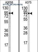 Western blot of anti-Autophagy APG9L1 Antibody in A2058 and A375 cell line lysates (35 ug/lane). APG9L1(arrow) was detected using the purified antibody.