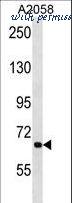 APG9L1 Antibody (W267) western blot of A2058 cell line lysates (35 ug/lane). The APG9L1 antibody detected the APG9L1 protein (arrow).