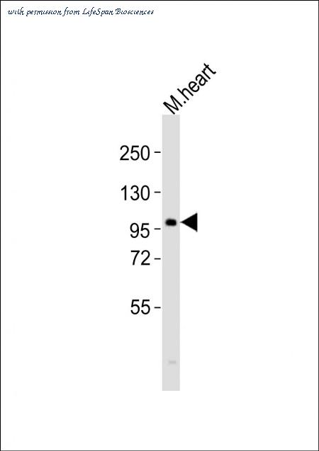 Anti-atg9a Antibody at 1:2000 dilution + mouse heart lysates Lysates/proteins at 20 ug per lane. Secondary Goat Anti-Rabbit IgG, (H+L), Peroxidase conjugated at 1/10000 dilution Predicted band size : 96 kDa Blocking/Dilution buffer: 5% NFDM/TBST.