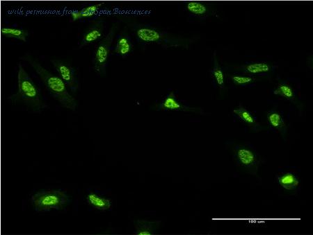 Immunofluorescence of monoclonal antibody to GAN on HeLa cell . [antibody concentration 10 ug/ml]