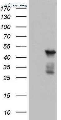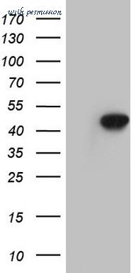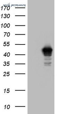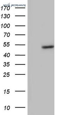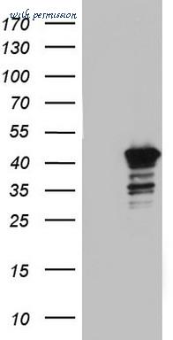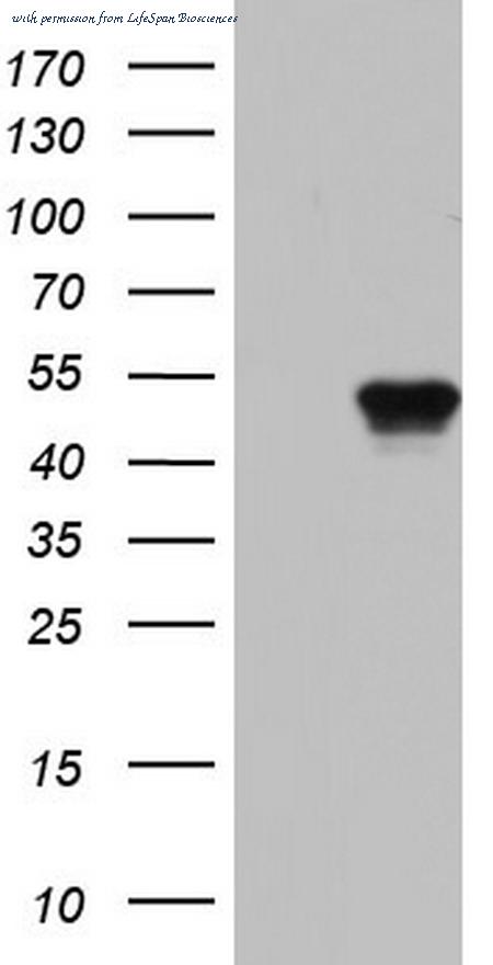 HEK293T cells were transfected with the pCMV6-ENTRY control (Left lane) or pCMV6-ENTRY BFSP2 (Right lane) cDNA for 48 hrs and lysed. Equivalent amounts of cell lysates (5 ug per lane) were separated by SDS-PAGE and immunoblotted with anti-BFSP2.