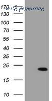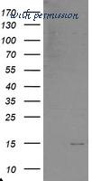 HEK293T cells were transfected with the pCMV6-ENTRY control (Left lane) or pCMV6-ENTRY C17orf37 (Right lane) cDNA for 48 hrs and lysed. Equivalent amounts of cell lysates (5 ug per lane) were separated by SDS-PAGE and immunoblotted with anti-C17orf37.