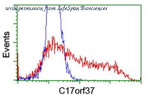 HEK293T cells transfected with either overexpress plasmid (Red) or empty vector control plasmid (Blue) were immunostained by anti-C17orf37 antibody, and then analyzed by flow cytometry.
