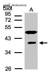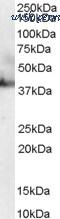 Antibody staining (0.03 ug/ml) of HepG2 lysate (RIPA buffer, 30 ug total protein per lane). Primary incubated for 1 hour. Detected by Western blot of chemiluminescence.