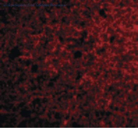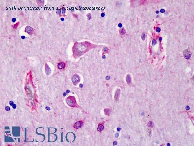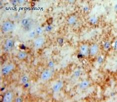 Immunofluorescence of Neurotrypsin in Human Brain cells with Neurotrypsin antibody at 20 ug/ml.