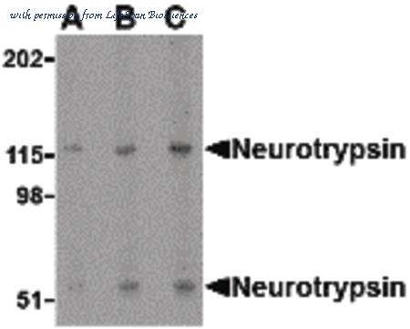 Western blot of neurotrypsin in SK-N-SH cell lysate with neurotrypsin antibody at (A) 0.5, (B) 1 and (C) 2 ug/ml.