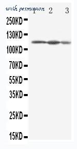 WB of EIF3B antibody. Lane 1: HELA Cell Lysate. Lane 2: 293T Cell Lysate. Lane 3: A431 Cell Lysate.