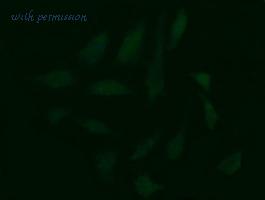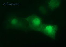 Immunofluorescent staining of HeLa cells using anti-CDC123 mouse monoclonal antibody.